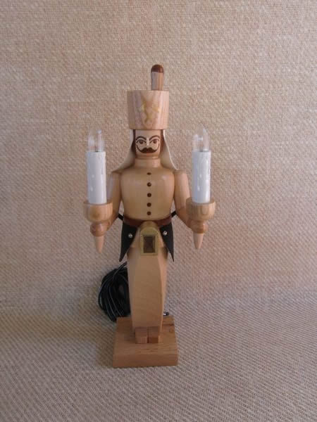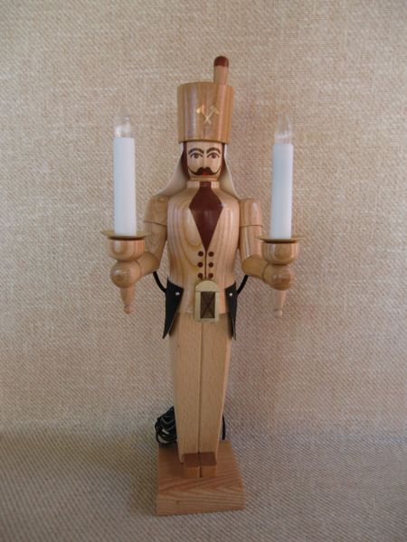 - Handgefertigter Engel und Bergmann, mit elektisch beleuchteten Kerzen und Grubenlampe. Bergmann mit Erzschale.